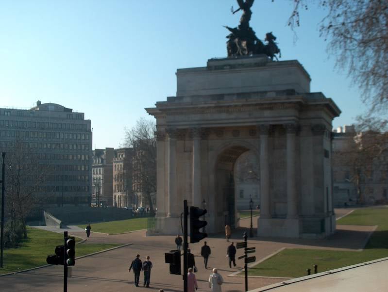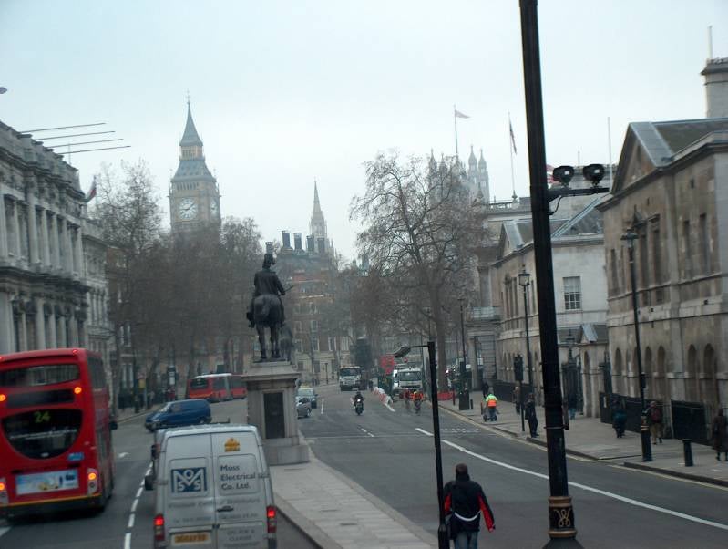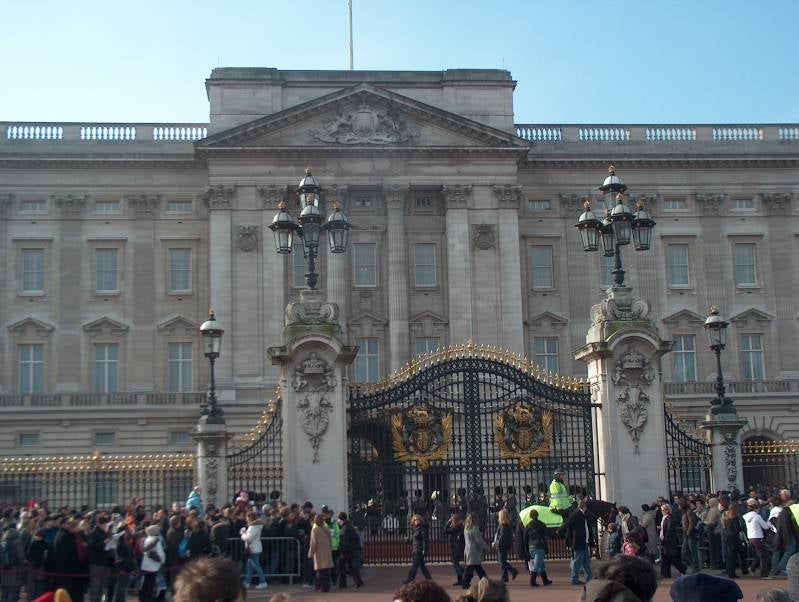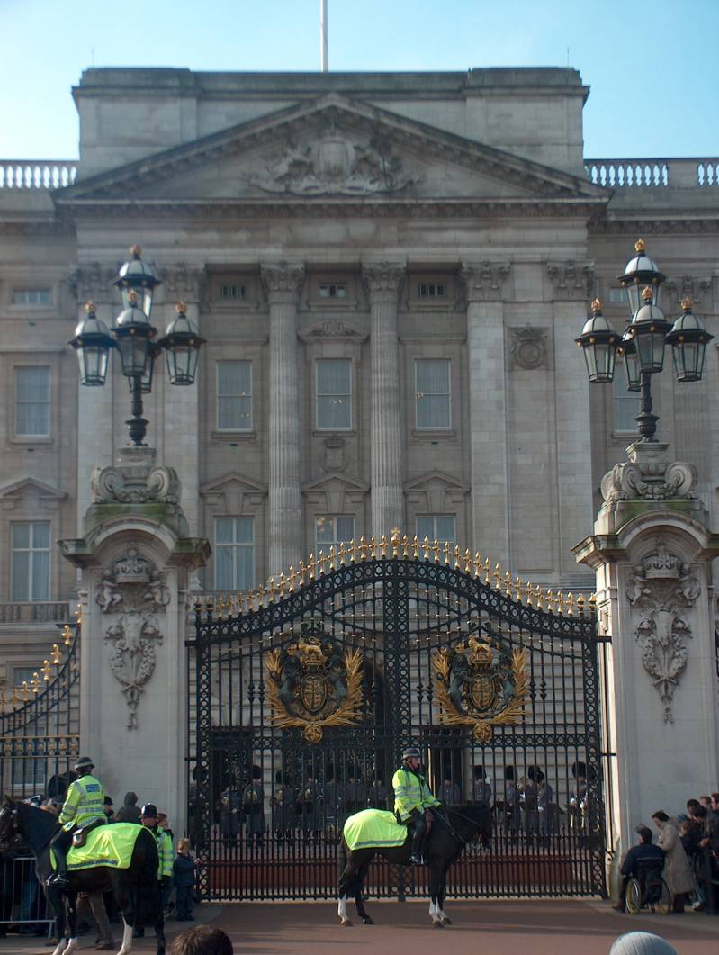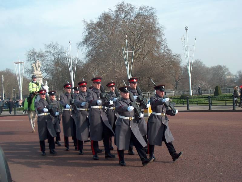 Wanneer ik langs Buckingham Palace rijdt, is het wisselen van de wacht nog bezig. Het is een behoorlijke desillusie, de eeuwenoude ceremonie vindt plaats achter de hoge hekken en rijen toeristen. Het gebeuren wordt beschouwd als het beste voorbeeld van nog bestaande militaire praal, maar het lijkt erop dat die vandaag de dag voornamelijk voor de toeristen tentoon gesteld wordt.