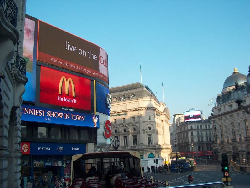 Piccadilly Circus geldt nog altijd als het kloppend hart van de hoofdstad en eigenlijk van het hele voormalige Britse Rijk als één van de drukste knooppunten van de binnenstad. Lower Regent Street, Haymarket, Shaftesbury Avenue, Coventry Street, Soho en Chinatown zijn samen met de bekende felle neonverlichting onderdeel van West End en komen hier samen bij het middelpunt van het plein: de fontein met het Erosbeeld. De neonreclame die het plein nog steeds zijn bijzondere impuls geeft, was in 1890 de eerste lichtreclame ter wereld.