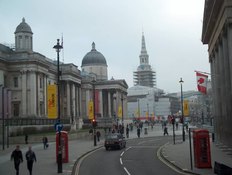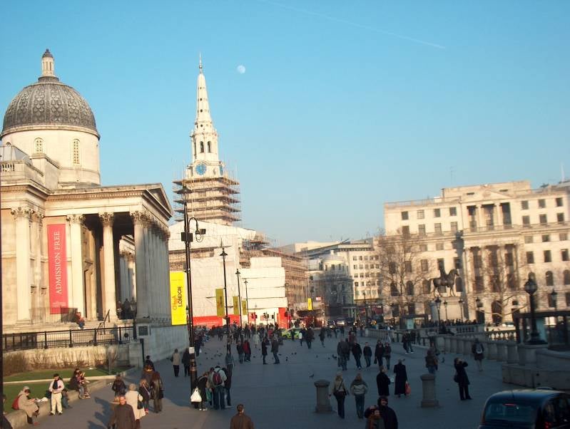 Trafalgar Square, een plein zoals in vele Europese steden te vinden, een verzamelplaats voor toeristen en duiven. Het plein wordt omringt door de National Gallery met een verzameling West-Europese kunst, het Canada House, het South-Africa House, Uganda House en de kerk St. Martin-in-the-Fields. De Pall Mall, de Mall, een brede koninklijke boulevard die naar Buckingham Palace voert, Whitehall en Charing Cross komen hier samen.