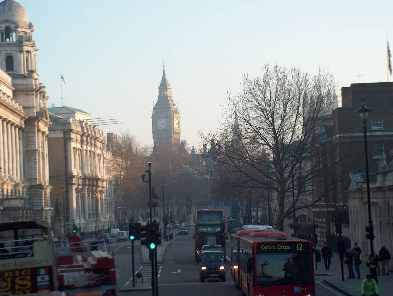 Hier zijn diverse manieren om in de Britse hoofdstad te komen, die zo'n goede 50 km verderop ligt. Zo kun je de Stansted Express trein nemen, die je in 3 kwartier naar Liverpool station brengt. Er rijden ook diverse buslijnen vanaf de luchthaven naar dit station, evenals naar het Victoria Station. Ik kies voor deze laatste optie die wel wat meer tijd kost, maar het voordeel heeft dat ik meteen naar het stadsdeel gebracht wordt waar ik wil zijn en alvast wat van Londen zie. De bus rijdt nl dwars door Londen en 75 minuten later sta ik op Buckingham Palace road, centraal en midden in de wereldstad. Het is een prachtige winterdag, de stad heet mij welkom met een stralend blauwe lucht en lekker zonnetje.
