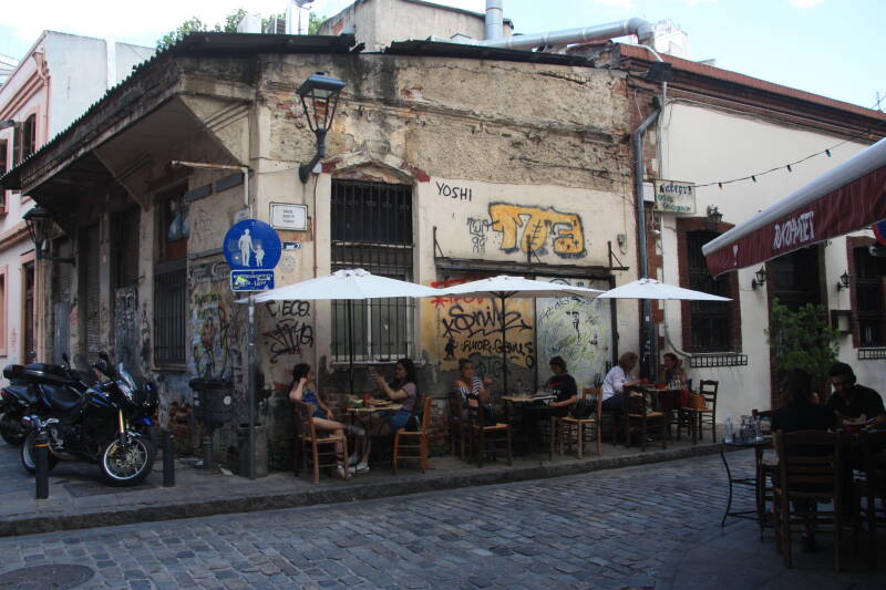Als de avond valt bevolken studenten de straatjes van Ladadika, het vroegere domein van olie- en specerijenhandelaars. Waar ooit de fabrieken waren, speelt zich nu het nachtleven af. De naam Ladadika betekent letterlijk winkels die olie verkopen, met een link naar olijfolie. Deze buurt, dichtbij de haven en het centrum, was oorspronkelijk het handelscentrum met de markt en een grote bazaar. Nu is het een soort van Stratumseind van Thessaloniki, overdag levendig met de vele terrasjes, maar blijkbaar vooral tot in de vroege uurtjes the place to be. Veel van de kleurrijke panden zijn tegenwoordig bezet door de locale horeca. In de hippe bars, pubs, trendy eetgelegenheden en clubs gaat het 24 uur per dag door. 's Morgens zijn de terrassen al gevuld en vroeg in de avond wordt er gegeten, waarna tegen middernacht de muziek harder gaat en de eetgelegenheden veranderen in een soort van discotheken waar de Grieken dansen tussen en op de tafeltjes.