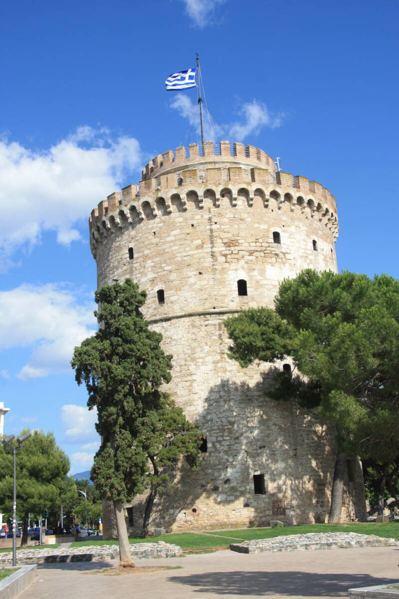 Verderop aan de waterkant ligt een icoon van de stad, de Witte Toren of Lefkos Pyrgos, is het meest bekende monument van Thessaloniki en het symbool van de stad vanwege zijn prominente plaats, lange geschiedenis en imposante architectuur. Deze werd gebouwd als verdedigingsbolwerk door de Ottomanen, die hem Leeuwentoren noemden. Deze 37 meter hoge toren werd in de 16e eeuw gebouwd en aanvankelijk was het een uitkijkpost en versterking van de stadsmuur. De toren was omgeven door lange verdedigingsmuren die het gebied omsloten en zware kanonnen konden dragen. Deze muren werden gesloopt in het begin van de 20e eeuw. Het gebouw heeft verschillende functies gehad, zo was het een tijd een gevangenis voor zwaar gedetineerden. Vanwege zijn bekendheid als een beruchte gevangenis stond de Witte Toren bekend als "Tower of Blood" (Kanli Kule) of Red Tower. Het werd omgedoopt tot Witte toren (Torre Blanca) nadat het in 1891 was witgekalkt en is nu in gebruik als museum voor de geschiedenis van de stad.