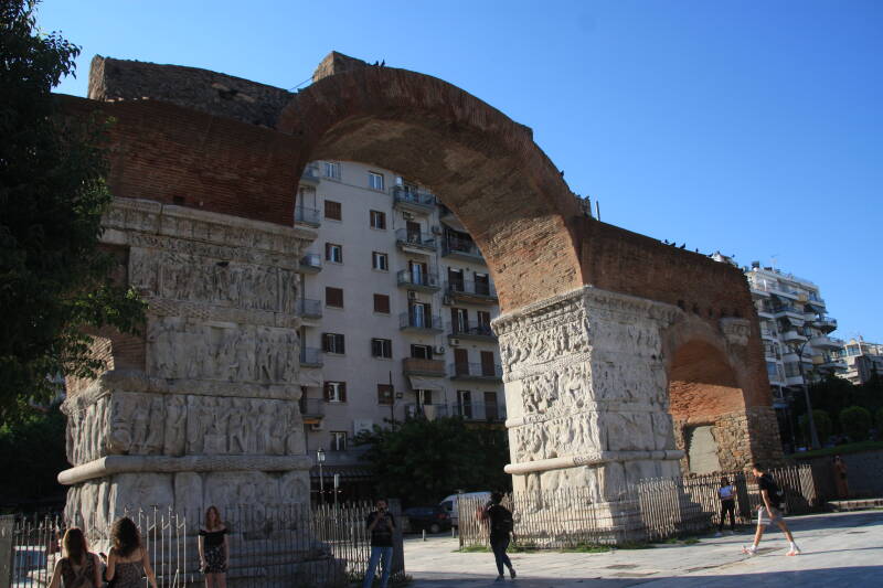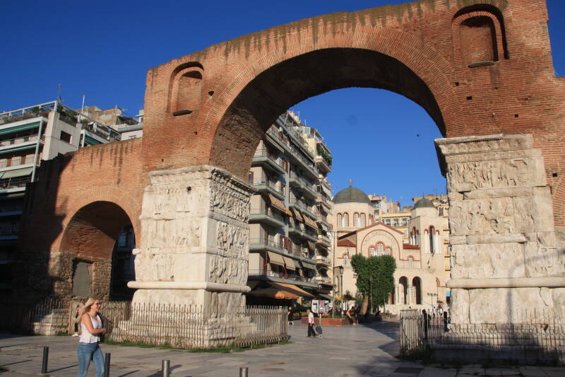 Keizer Galerius bouwde een keizerlijk paleiscomplex in Thessaloniki, waarvan de Galerius boog (kamara) en Rotonda basiselementen waren. Op de ruïnes van de in het jaar 297 opgerichte triomfboog laten talrijke reliëfs de wrede gruweldaden van deze zegevierende keizer zien. In zijn oorspronkelijke vorm had de boog vier hoofdpijlers en vier secundaire pijlers, twee aan de noordkant en twee in het zuiden. Tegenwoordig zijn nog maar twee van de belangrijkste pijlers en een van de secundaire pijlers aanwezig en gerestaureerd. De Galeriusboog herinnert aan de lange, rijke Romeinse geschiedenis van de stad en was samen met de Rotonda onderdeel van een groter complex dat het paleis van Galerius omvatte. De resten van zijn monumentale paleis, op 200m hiervandaan, laten zien hoe comfortabel zijn leven als overwinnaar was.