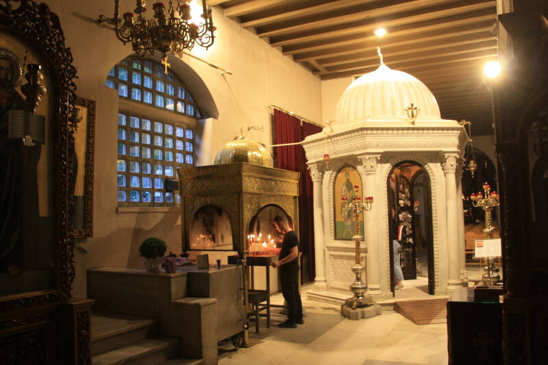 De heilige Dimitrios beschermt de stad al meer dan 1500 jaar, zij het met wisselend succes. Geen orthodoxe gelovige zal de stad verlaten zonder hem eer te bewijzen. Daarom is het rond zijn ziveren sarcofaag altijd druk.