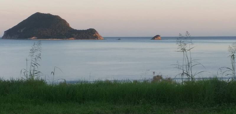 Een stukje uit de kust tegenover ons vakantieadres zien we Marathonisi liggen, een klein eilandje waar de enige vaste bewoner de Caretta schilpad is. Met enige fantasie doet het eiland vanaf een afstandje zelfs aan de vorm van een schildpad denken.