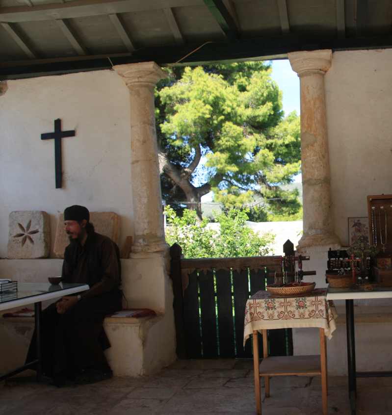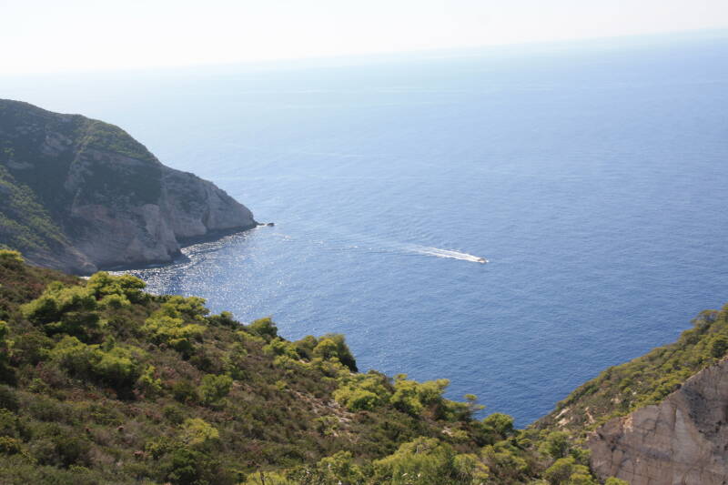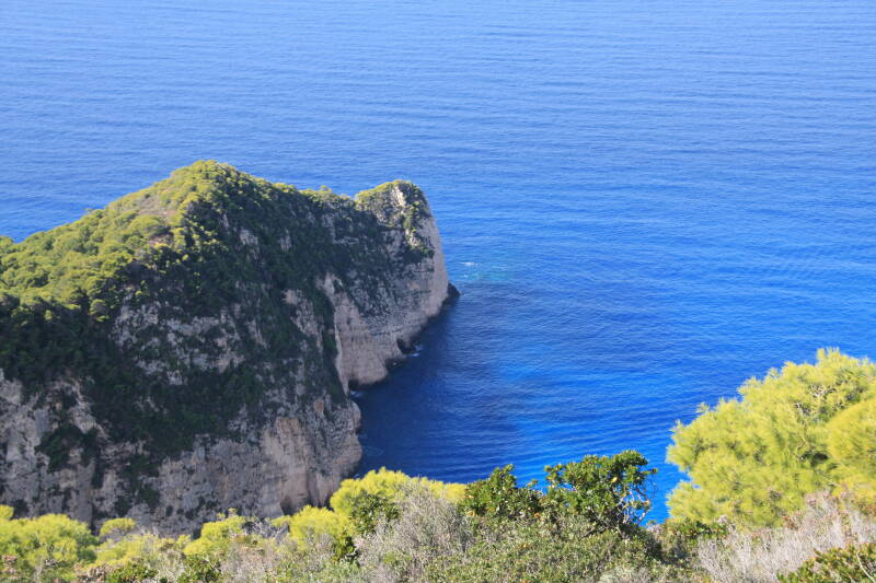 Wij nemen de steile kustweg met prachtige uitzichten vanaf het klooster om het natuurschoon van bovenaf te bewonderen. Aan het einde van de 1km lange weg is een rommelige, rotsachtige parkeerplaats. Tegen de rots is een speciaal uitzichtpunt gemaakt waar de struiken het uitzicht op het schip wel wat beperken. Er is een wandelpad over de rotsen, voor een mooi wandelingetje boven de blauwe zee met een verfrissend zeewindje