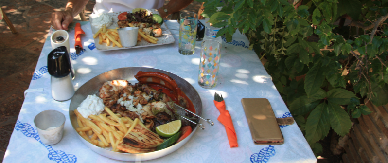 De hoofdstraat loopt dood op het strand, waarlangs de tavernes in beiden richtingen uiteen waaieren. Overal liggen de terrasjes, bars, souvernirshops en vakantieverblijven voor het oprapen.