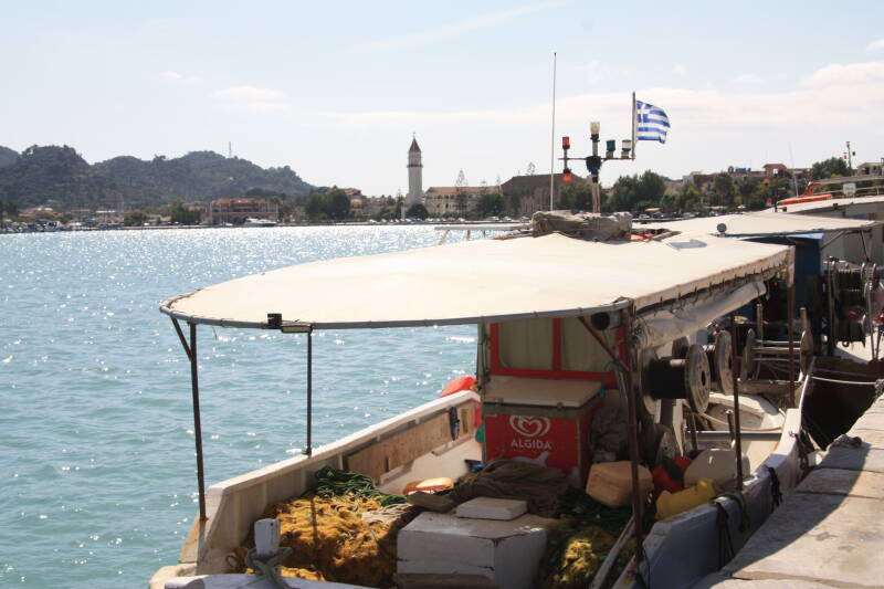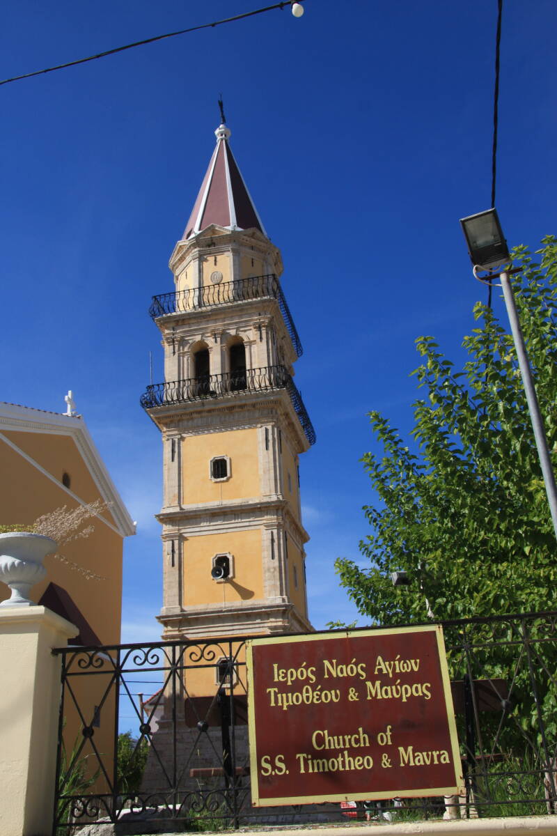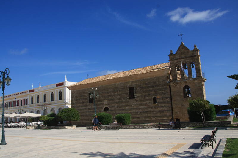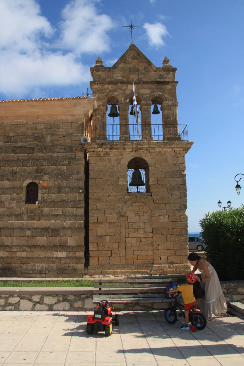 Aan de zuidkant van de kade, schuin tegenover de grote, gratis parkeerplaats, staat een elegante en gezichtsbepalende klokkentoren in Venetiaanse stijl. Deze campanille is het oriëntatiepunt van de stad. Daarnaast staat de belangrijkste kerk van Zakynthos, de ag. Dionisioskerk.