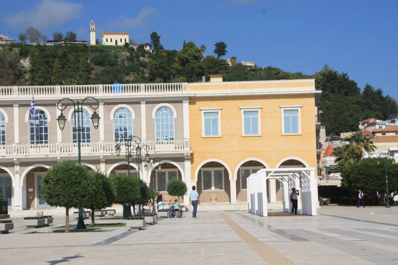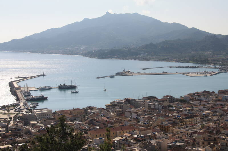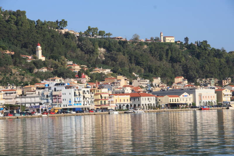 Zakinthos-stad ligt langgerekt aan haar haven de straten landinwaarts lopen al snel de heuvel op die de scheiding vormt tussen stad en het achterliggende laagland. Op die heuvel ligt ook de Venetiaanse vesting, een van de weinige herinneringen aan deze periode.