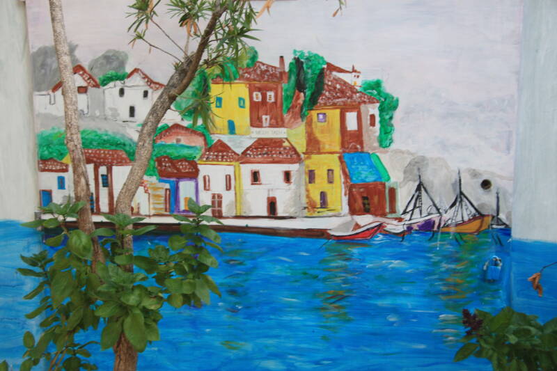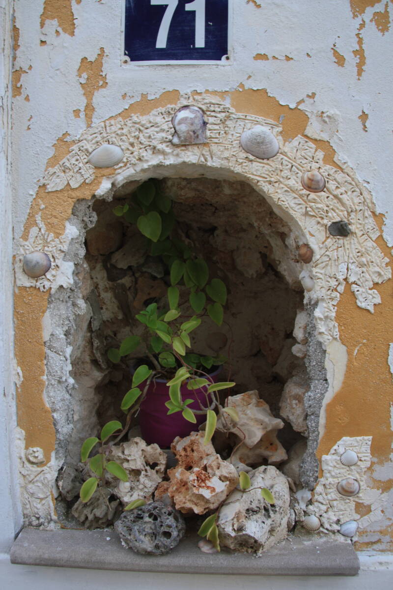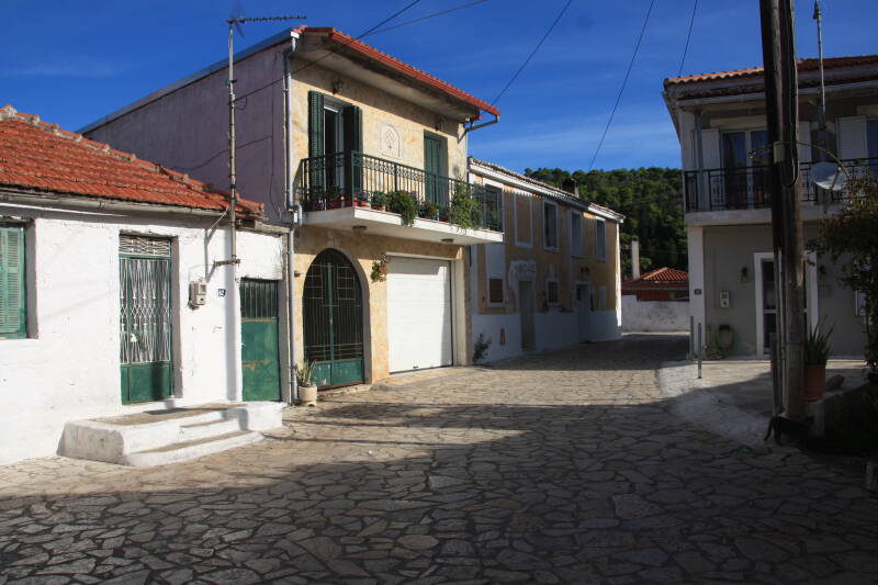 Als je achter de gedrapeerde kleden de straatjes inloopt, tref je al snel de typisch Griekse dorpssfeer van steegjes, traten, ruwe straten, verzorgde tuintjes en open voordeuren.