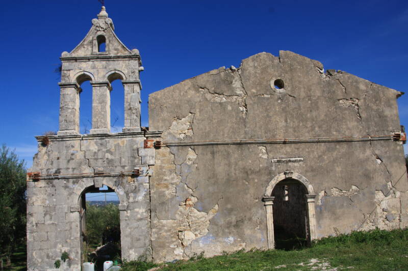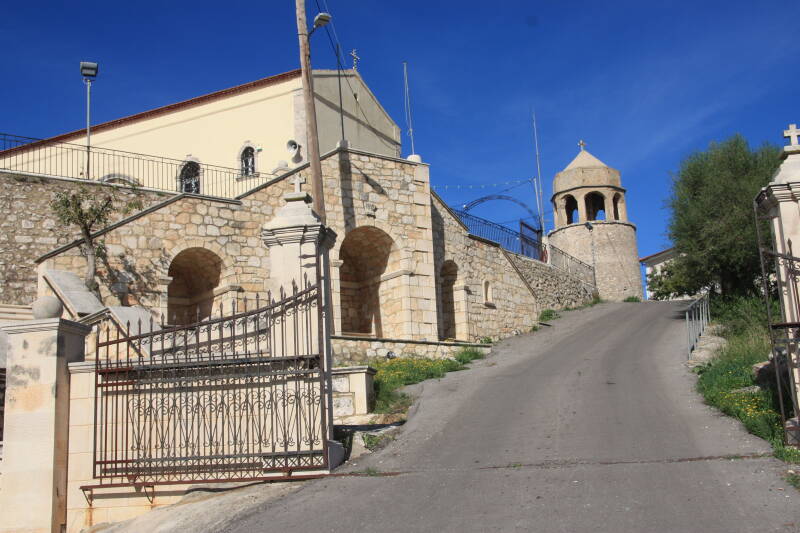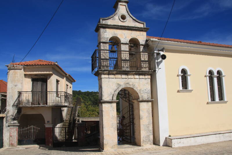 Het bergdorp Ano Volimes, kijkt uit over de zee en ligt in de schaduw van het zusterdorp. De kerk aan het dorpsplein werd na de aardbeving van 1953 herbouwd.