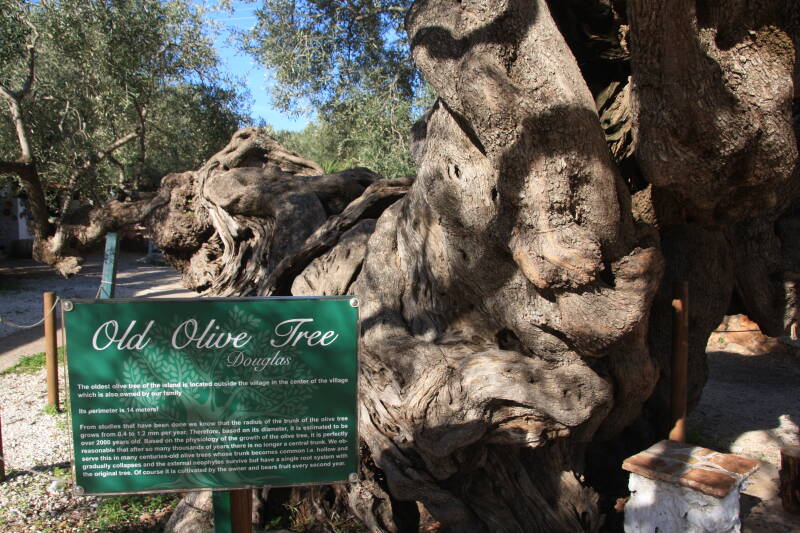 De weg vanuit Agios Leon in noordwestelijke richting, leidt in 6km naar Exo Chora. Als er geen eeuwenoude olijfboom zou staan, zouden we dit dorpje op onze route waarschijnlijk gewoon passeren, maar net als vele andere toeristen maken we even een fotostop. Daar wordt flink van geprofiteerd door de verkopers van souveniers in de kraampjes langs de weg.