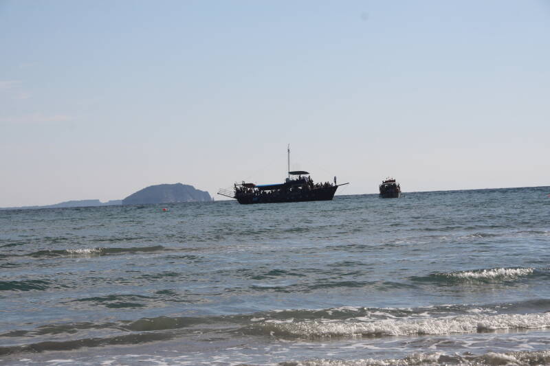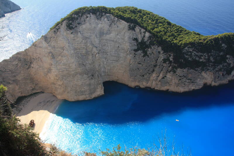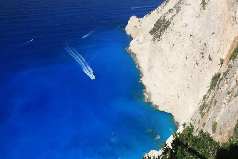 Vanaf Paralia Navagio vertrekken vele bootjes voor een rondvaart naar Shipwreck Beach.