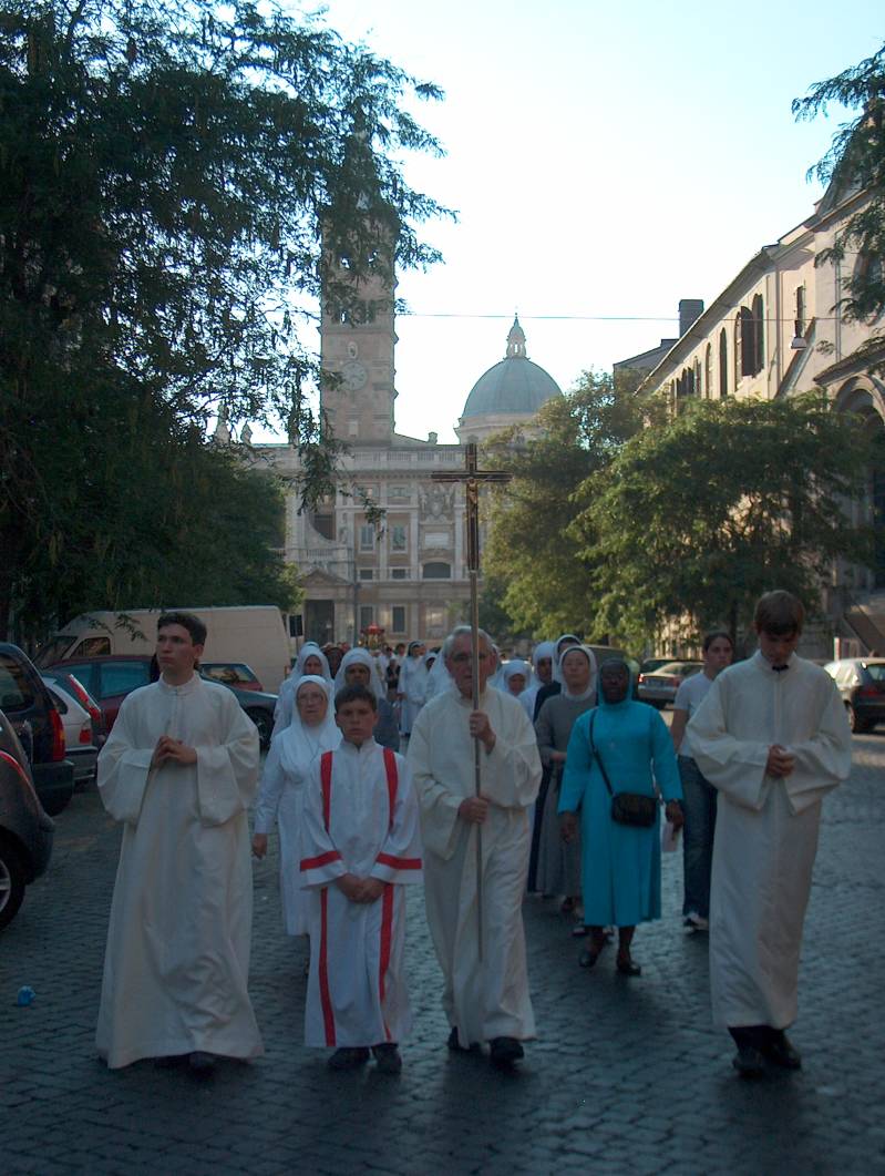 Een prima accomodatie in een oud pand, met behulpzame mensen en vriendelijke service, wat voor de Romeinse hotels niet vanzelfsprekend is. We krijgen de keuze uit 2 kamers en kiezen de rustigste, die boven een binnenplaatsje ligt. We zitten midden in de drukke stad, maar daar zullen we hier geen last van hebben. Nadat we ons wat opgefrist hebben wordt het ook tijd voor een inwendig opfrissertje. Vanaf het terrasje tegenover de kerk zien we een processie door de straat trekken, dit katholieke gebeuren blijkt hier op de zondagnamiddag nog volop gebruikelijk.