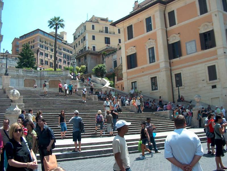 Geen enkele andere zitplaats in Rome is meer in trek als de treden van de Spaanse Trappen op het Piazza di Spagna. Bedevaartgangers, rugzaktoeristen, reisgroepen en reizigers hangen hier rond, maar ook voor -vooral jonge- Italianen zelf is het plein en de trappen een gewilde ontmoetingsplek. Het is hier een komen en gaan van vele nationaliteiten en toch vind ik er een sfeer van rust en gezelligheid.