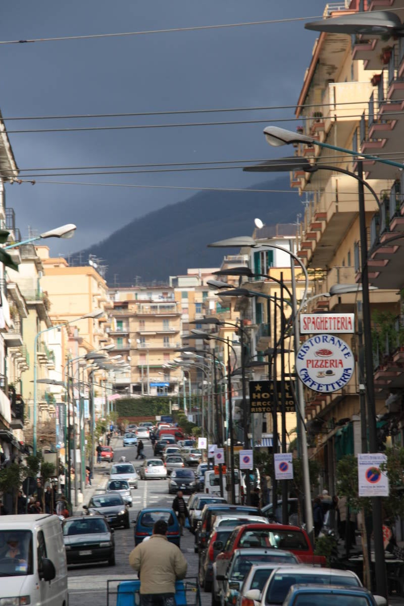 Het huidige Ercolano, met de Vesuvius op de achtergrond. Vandaag helaas met de top in de wolken.