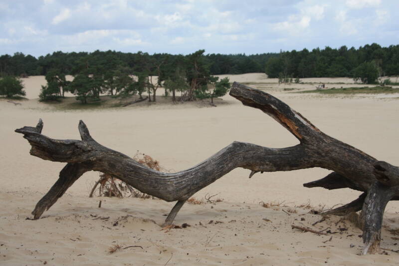 Niet de Sahara of Death Valley, maar gewoon in ons Brabant. Het gebied heeft een interessante geologische geschiedenis, waarin met man en macht is geprobeerd het zand in toom te houden. Als je hier rondloopt, zijn de restanten daarvan nog zichtbaar, van de aangeplante bomen om het stuiven tegen te houden, zie je de toppen soms nog net boven het zand uit piepen. Verder is het gewas compleet bedolven onder de duinen.