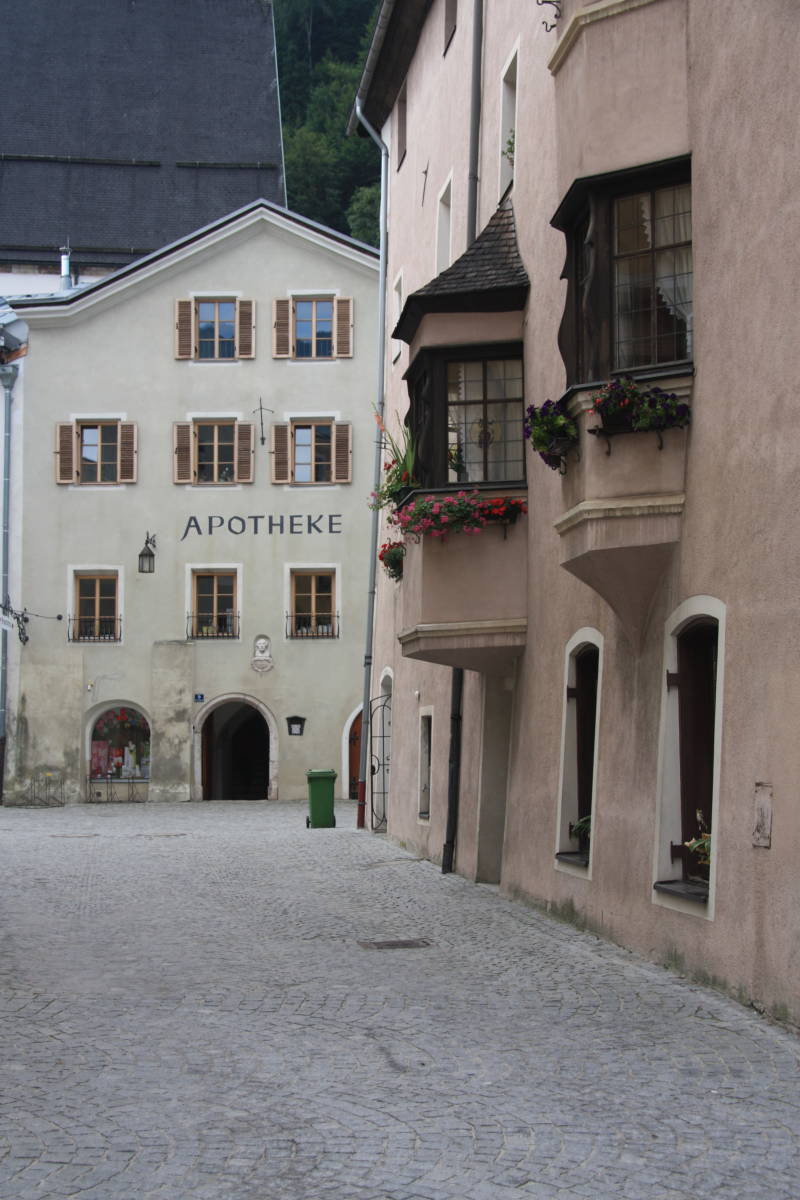 Bij het verlaten van de Unterer Stadtplatz loop je de kerk voorbij en daarna kom je op de binnenplaats van de vesting, een wereld op zich, volgepropt met historie, maar ook met menig lijk in de kasten.