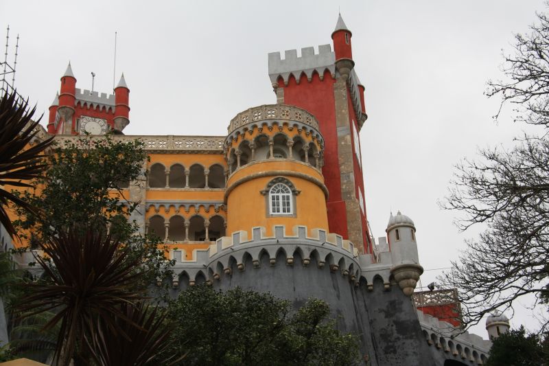 In Sintra rijdt een toeristenbus een rondje langs het Castelo dos Mouros en het Palacio da Pena in de heuvels buiten Sintra. De weg slingert de berg op tot aan de parkeerplaats bij het paleis, dat in een groot park ligt.