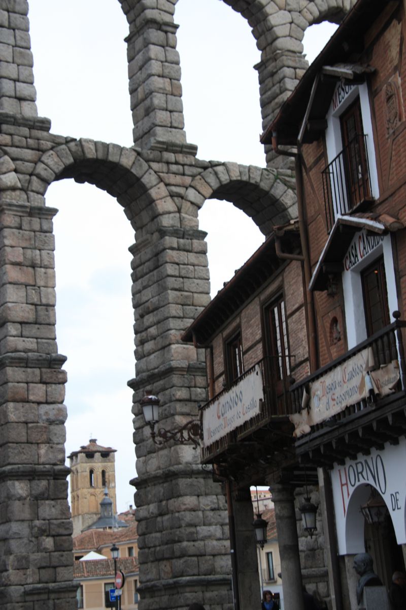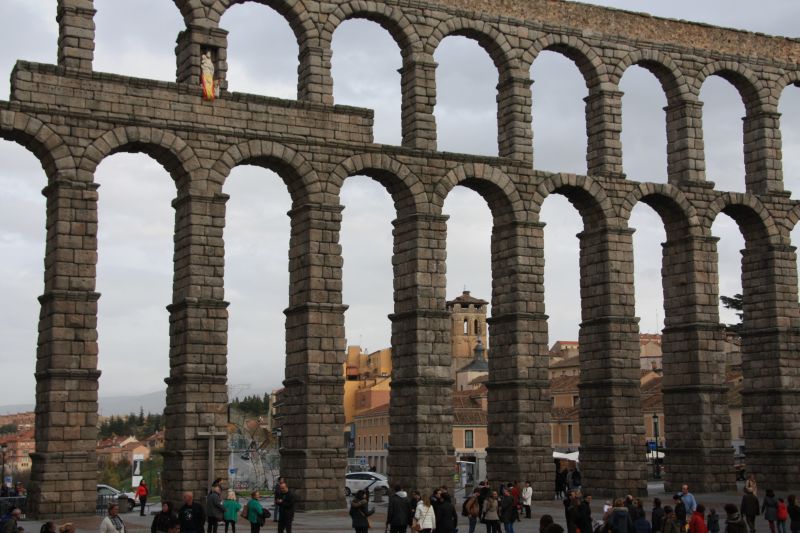 Nog voordat we het busstation bereiken, bestaat de eerste aanblik uit het machtige Romeinse aquaduct. Samen met de kathedraal en het alcazar dankt Segovia de status van werelderfgoed aan deze fraaie monumenten.