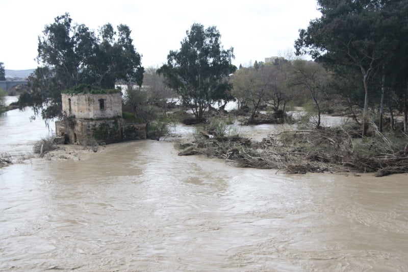 Na herhaaldelijk straal de verkeerde kant op te zijn gelopen gebeurd het dan toch nog. We lopen nietsvermoedend langs de buiten zijn oevers getreden Guadalquivir rivier en plotseling doemt het silhout van Cordoba op. Naast elkaar zien we het Alcazar, het eenvoudige bisschoppelijke paleis en ten slotte de Mezquita verschijnen. Een Romeinse brug die nog op bevel van keizer Augustius is gebouwd, de Puente Romano, overspant de rivier. Aan de overkant staat de gekanteelde Torre de la Calhorra, in de 14de eeuw gebouwd om het bruggenhoofd te verdedigen.